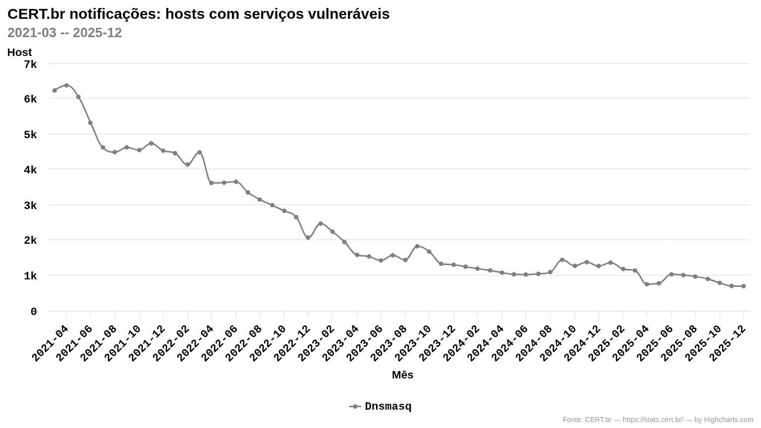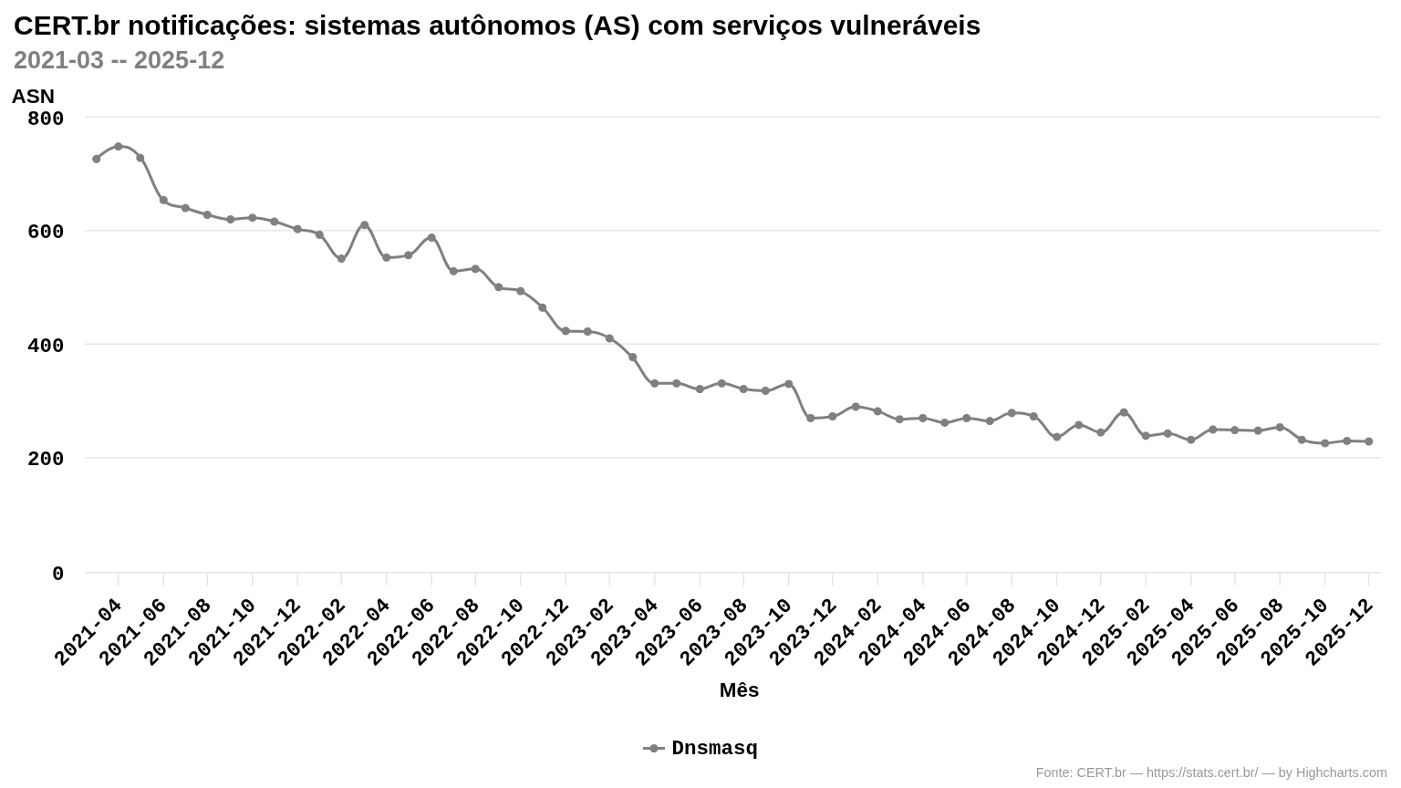 De março de 2021 a dezembro de 2025 o CERT.br notificou dispositivos com versões vulneráveis de Dnsmasq expostos na Internet. Os CVE notificados e a data de início são: